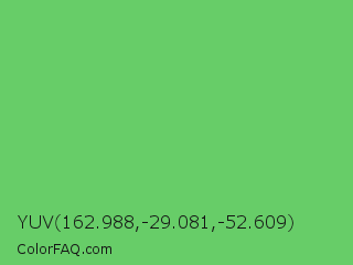 YUV 162.988,-29.081,-52.609 Color is a normal green color and the nearest color is Mantis #74c365. Hex code #67cd68 and RGB value is rgb(103,205,104). In RGB color space, this color is composed of 40% red, 80% green, 41% blue, In CMYK color space, this color is composed of 50% cyan, 0% magenta, 49% yellow , 20% black , In HSL color space, this color has a hue angle of 121° , 50% saturation and 60% lightness.