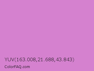 YUV 163.008,21.688,43.843 Color is a light magenta color and the nearest color is French Mauve #d473d4. Hex code #d581cf and RGB value is rgb(213,129,207). In RGB color space, this color is composed of 84% red, 51% green, 81% blue, In CMYK color space, this color is composed of 0% cyan, 39% magenta, 3% yellow , 16% black , In HSL color space, this color has a hue angle of 304° , 50% saturation and 67% lightness.