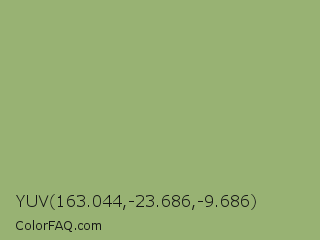 YUV 163.044,-23.686,-9.686 Color is a normal green color and the nearest color is Olivine #9ab973. Hex code #98b273 and RGB value is rgb(152,178,115). In RGB color space, this color is composed of 60% red, 70% green, 45% blue, In CMYK color space, this color is composed of 15% cyan, 0% magenta, 35% yellow , 30% black , In HSL color space, this color has a hue angle of 85° , 29% saturation and 57% lightness.