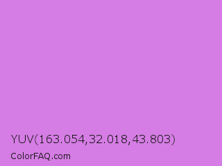YUV 163.054,32.018,43.803 Color is a light purple color and the nearest color is French Mauve #d473d4. Hex code #d57de4 and RGB value is rgb(213,125,228). In RGB color space, this color is composed of 84% red, 49% green, 89% blue, In CMYK color space, this color is composed of 7% cyan, 45% magenta, 0% yellow , 11% black , In HSL color space, this color has a hue angle of 291° , 66% saturation and 69% lightness.