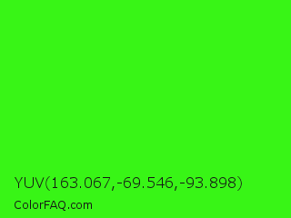 YUV 163.067,-69.546,-93.898 Color is a normal green color and the nearest color is Neon Green #39ff14. Hex code #38f516 and RGB value is rgb(56,245,22). In RGB color space, this color is composed of 22% red, 96% green, 9% blue, In CMYK color space, this color is composed of 77% cyan, 0% magenta, 91% yellow , 4% black , In HSL color space, this color has a hue angle of 111° , 92% saturation and 52% lightness.