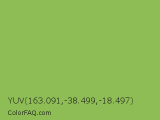 YUV 163.091,-38.499,-18.497 Color is a normal green color and the nearest color is Dollar Bill #85bb65. Hex code #8ebd55 and RGB value is rgb(142,189,85). In RGB color space, this color is composed of 56% red, 74% green, 33% blue, In CMYK color space, this color is composed of 25% cyan, 0% magenta, 55% yellow , 26% black , In HSL color space, this color has a hue angle of 87° , 44% saturation and 54% lightness.