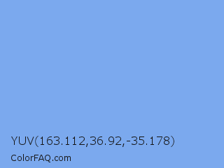YUV 163.112,36.92,-35.178 Color is a light blue color and the nearest color is Aero #7cb9e8. Hex code #7ba9ee and RGB value is rgb(123,169,238). In RGB color space, this color is composed of 48% red, 66% green, 93% blue, In CMYK color space, this color is composed of 48% cyan, 29% magenta, 0% yellow , 7% black , In HSL color space, this color has a hue angle of 216° , 77% saturation and 71% lightness.