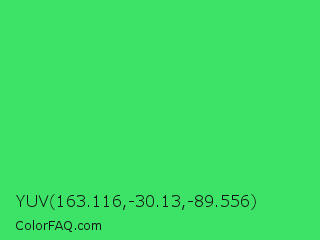 YUV 163.116,-30.13,-89.556 Color is a normal green color and the nearest color is UFO Green #3cd070. Hex code #3de366 and RGB value is rgb(61,227,102). In RGB color space, this color is composed of 24% red, 89% green, 40% blue, In CMYK color space, this color is composed of 73% cyan, 0% magenta, 55% yellow , 11% black , In HSL color space, this color has a hue angle of 135° , 75% saturation and 56% lightness.