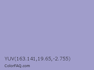 YUV 163.141,19.65,-2.755 Color is a light indigo color and the nearest color is Blue Bell #a2a2d0. Hex code #a09dcb and RGB value is rgb(160,157,203). In RGB color space, this color is composed of 63% red, 62% green, 80% blue, In CMYK color space, this color is composed of 21% cyan, 23% magenta, 0% yellow , 20% black , In HSL color space, this color has a hue angle of 244° , 31% saturation and 71% lightness.