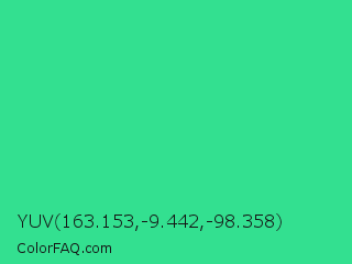 YUV 163.153,-9.442,-98.358 Color is a normal green color and the nearest color is Shamrock #33cc99. Hex code #33e090 and RGB value is rgb(51,224,144). In RGB color space, this color is composed of 20% red, 88% green, 56% blue, In CMYK color space, this color is composed of 77% cyan, 0% magenta, 36% yellow , 12% black , In HSL color space, this color has a hue angle of 152° , 74% saturation and 54% lightness.