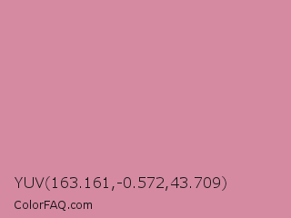 YUV 163.161,-0.572,43.709 Color is a light rose color and the nearest color is Can Can #d591a4. Hex code #d58aa2 and RGB value is rgb(213,138,162). In RGB color space, this color is composed of 84% red, 54% green, 64% blue, In CMYK color space, this color is composed of 0% cyan, 35% magenta, 24% yellow , 16% black , In HSL color space, this color has a hue angle of 341° , 47% saturation and 69% lightness.