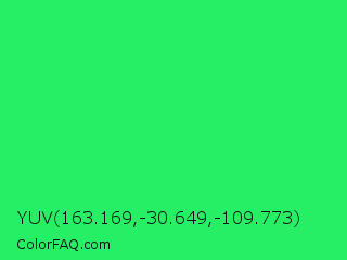 YUV 163.169,-30.649,-109.773 Color is a normal green color and the nearest color is UFO Green #3cd070. Hex code #26ef65 and RGB value is rgb(38,239,101). In RGB color space, this color is composed of 15% red, 94% green, 40% blue, In CMYK color space, this color is composed of 84% cyan, 0% magenta, 58% yellow , 6% black , In HSL color space, this color has a hue angle of 139° , 86% saturation and 54% lightness.