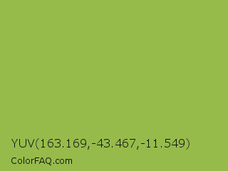 YUV 163.169,-43.467,-11.549 Color is a normal green color and the nearest color is Android Green #a4c639. Hex code #96bb4b and RGB value is rgb(150,187,75). In RGB color space, this color is composed of 59% red, 73% green, 29% blue, In CMYK color space, this color is composed of 20% cyan, 0% magenta, 60% yellow , 27% black , In HSL color space, this color has a hue angle of 80° , 45% saturation and 51% lightness.