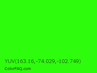YUV 163.16,-74.029,-102.749 Color is a normal green color and the nearest color is Neon Green #39ff14. Hex code #2efc0d and RGB value is rgb(46,252,13). In RGB color space, this color is composed of 18% red, 99% green, 5% blue, In CMYK color space, this color is composed of 82% cyan, 0% magenta, 95% yellow , 1% black , In HSL color space, this color has a hue angle of 112° , 98% saturation and 52% lightness.