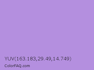 YUV 163.183,29.49,14.749 Color is a light violet color and the nearest color is Bright Lavender #bf94e4. Hex code #b48fdf and RGB value is rgb(180,143,223). In RGB color space, this color is composed of 71% red, 56% green, 87% blue, In CMYK color space, this color is composed of 19% cyan, 36% magenta, 0% yellow , 13% black , In HSL color space, this color has a hue angle of 268° , 56% saturation and 72% lightness.