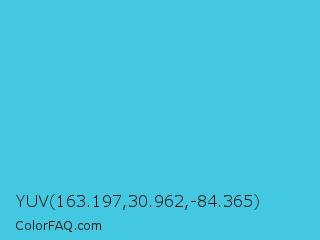 YUV 163.197,30.962,-84.365 Color is a normal cyan color and the nearest color is Sea Serpent #4bc7cf. Hex code #43c8e2 and RGB value is rgb(67,200,226). In RGB color space, this color is composed of 26% red, 78% green, 89% blue, In CMYK color space, this color is composed of 70% cyan, 12% magenta, 0% yellow , 11% black , In HSL color space, this color has a hue angle of 190° , 73% saturation and 57% lightness.