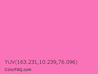 YUV 163.231,10.239,76.096 Color is a light rose color and the nearest color is Hot Pink #ff69b4. Hex code #fa73b8 and RGB value is rgb(250,115,184). In RGB color space, this color is composed of 98% red, 45% green, 72% blue, In CMYK color space, this color is composed of 0% cyan, 54% magenta, 26% yellow , 2% black , In HSL color space, this color has a hue angle of 329° , 93% saturation and 72% lightness.
