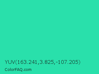 YUV 163.241,3.825,-107.205 Color is a normal green color and the nearest color is Eucalyptus #44d7a8. Hex code #29e0ab and RGB value is rgb(41,224,171). In RGB color space, this color is composed of 16% red, 88% green, 67% blue, In CMYK color space, this color is composed of 82% cyan, 0% magenta, 24% yellow , 12% black , In HSL color space, this color has a hue angle of 163° , 75% saturation and 52% lightness.