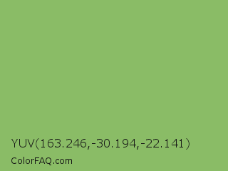 YUV 163.246,-30.194,-22.141 Color is a normal green color and the nearest color is Dollar Bill #85bb65. Hex code #8abc66 and RGB value is rgb(138,188,102). In RGB color space, this color is composed of 54% red, 74% green, 40% blue, In CMYK color space, this color is composed of 27% cyan, 0% magenta, 46% yellow , 26% black , In HSL color space, this color has a hue angle of 95° , 39% saturation and 57% lightness.