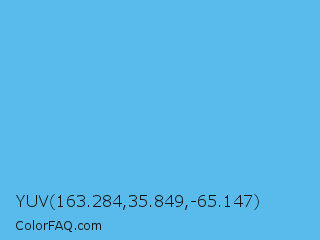 YUV 163.284,35.849,-65.147 Color is a light blue color and the nearest color is Blue Jeans #5dadec. Hex code #59bbec and RGB value is rgb(89,187,236). In RGB color space, this color is composed of 35% red, 73% green, 93% blue, In CMYK color space, this color is composed of 62% cyan, 21% magenta, 0% yellow , 7% black , In HSL color space, this color has a hue angle of 200° , 79% saturation and 64% lightness.