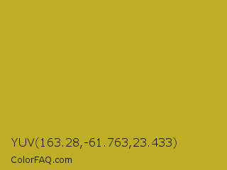 YUV 163.28,-61.763,23.433 Color is a normal yellow color and the nearest color is Hokey Pokey #c8a528. Hex code #beae26 and RGB value is rgb(190,174,38). In RGB color space, this color is composed of 75% red, 68% green, 15% blue, In CMYK color space, this color is composed of 0% cyan, 8% magenta, 80% yellow , 25% black , In HSL color space, this color has a hue angle of 54° , 67% saturation and 45% lightness.