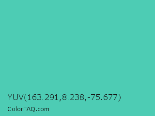 YUV 163.291,8.238,-75.677 Color is a normal cyan color and the nearest color is Eucalyptus #44d7a8. Hex code #4dccb4 and RGB value is rgb(77,204,180). In RGB color space, this color is composed of 30% red, 80% green, 71% blue, In CMYK color space, this color is composed of 62% cyan, 0% magenta, 12% yellow , 20% black , In HSL color space, this color has a hue angle of 169° , 55% saturation and 55% lightness.