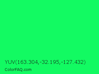 YUV 163.304,-32.195,-127.432 Color is a normal green color and the nearest color is Spring Green #00ff7f. Hex code #12fa62 and RGB value is rgb(18,250,98). In RGB color space, this color is composed of 7% red, 98% green, 38% blue, In CMYK color space, this color is composed of 93% cyan, 0% magenta, 61% yellow , 2% black , In HSL color space, this color has a hue angle of 141° , 96% saturation and 53% lightness.