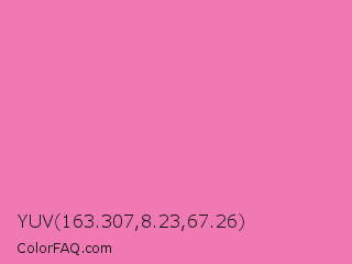 YUV 163.307,8.23,67.26 Color is a light rose color and the nearest color is Persian Pink #f77fbe. Hex code #f079b4 and RGB value is rgb(240,121,180). In RGB color space, this color is composed of 94% red, 47% green, 71% blue, In CMYK color space, this color is composed of 0% cyan, 50% magenta, 25% yellow , 6% black , In HSL color space, this color has a hue angle of 330° , 80% saturation and 71% lightness.