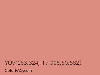 YUV 163.324,-17.908,50.582 Color is a light red color and the nearest color is Burning Sand #d99376. Hex code #dd8d7f and RGB value is rgb(221,141,127). In RGB color space, this color is composed of 87% red, 55% green, 50% blue, In CMYK color space, this color is composed of 0% cyan, 36% magenta, 43% yellow , 13% black , In HSL color space, this color has a hue angle of 9° , 58% saturation and 68% lightness.