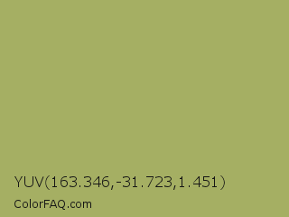 YUV 163.346,-31.723,1.451 Color is a normal yellow color and the nearest color is Green Smoke #a4af6e. Hex code #a5af63 and RGB value is rgb(165,175,99). In RGB color space, this color is composed of 65% red, 69% green, 39% blue, In CMYK color space, this color is composed of 6% cyan, 0% magenta, 43% yellow , 31% black , In HSL color space, this color has a hue angle of 68° , 32% saturation and 54% lightness.
