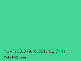 YUV 163.349,-6.581,-82.744 Color is a normal green color and the nearest color is Eucalyptus #44d7a8. Hex code #45d696 and RGB value is rgb(69,214,150). In RGB color space, this color is composed of 27% red, 84% green, 59% blue, In CMYK color space, this color is composed of 68% cyan, 0% magenta, 30% yellow , 16% black , In HSL color space, this color has a hue angle of 154° , 64% saturation and 55% lightness.