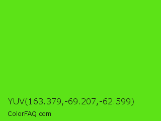 YUV 163.379,-69.207,-62.599 Color is a normal green color and the nearest color is Harlequin Green #46cb18. Hex code #5ce317 and RGB value is rgb(92,227,23). In RGB color space, this color is composed of 36% red, 89% green, 9% blue, In CMYK color space, this color is composed of 59% cyan, 0% magenta, 90% yellow , 11% black , In HSL color space, this color has a hue angle of 100° , 82% saturation and 49% lightness.
