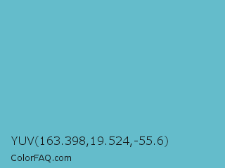 YUV 163.398,19.524,-55.6 Color is a normal cyan color and the nearest color is Fountain Blue #56b4be. Hex code #64bccb and RGB value is rgb(100,188,203). In RGB color space, this color is composed of 39% red, 74% green, 80% blue, In CMYK color space, this color is composed of 51% cyan, 7% magenta, 0% yellow , 20% black , In HSL color space, this color has a hue angle of 189° , 50% saturation and 59% lightness.