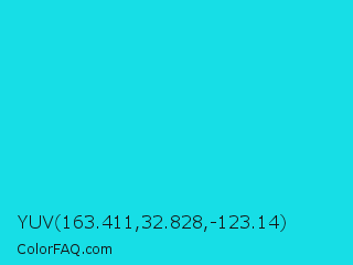 YUV 163.411,32.828,-123.14 Color is a normal cyan color and the nearest color is Bright Turquoise #08e8de. Hex code #17dee6 and RGB value is rgb(23,222,230). In RGB color space, this color is composed of 9% red, 87% green, 90% blue, In CMYK color space, this color is composed of 90% cyan, 3% magenta, 0% yellow , 10% black , In HSL color space, this color has a hue angle of 182° , 82% saturation and 50% lightness.