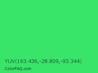 YUV 163.436,-28.809,-93.344 Color is a normal green color and the nearest color is UFO Green #3cd070. Hex code #39e569 and RGB value is rgb(57,229,105). In RGB color space, this color is composed of 22% red, 90% green, 41% blue, In CMYK color space, this color is composed of 75% cyan, 0% magenta, 54% yellow , 10% black , In HSL color space, this color has a hue angle of 137° , 77% saturation and 56% lightness.