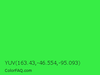 YUV 163.43,-46.554,-95.093 Color is a normal green color and the nearest color is Lime Green #32cd32. Hex code #37ed45 and RGB value is rgb(55,237,69). In RGB color space, this color is composed of 22% red, 93% green, 27% blue, In CMYK color space, this color is composed of 77% cyan, 0% magenta, 71% yellow , 7% black , In HSL color space, this color has a hue angle of 125° , 83% saturation and 57% lightness.