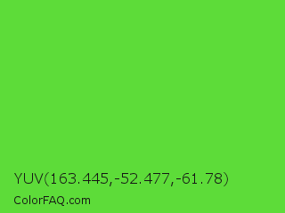 YUV 163.445,-52.477,-61.78 Color is a normal green color and the nearest color is Harlequin Green #46cb18. Hex code #5ddc39 and RGB value is rgb(93,220,57). In RGB color space, this color is composed of 36% red, 86% green, 22% blue, In CMYK color space, this color is composed of 58% cyan, 0% magenta, 74% yellow , 14% black , In HSL color space, this color has a hue angle of 107° , 70% saturation and 54% lightness.