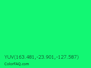 YUV 163.481,-23.901,-127.587 Color is a normal green color and the nearest color is Spring Green #00ff7f. Hex code #12f773 and RGB value is rgb(18,247,115). In RGB color space, this color is composed of 7% red, 97% green, 45% blue, In CMYK color space, this color is composed of 93% cyan, 0% magenta, 53% yellow , 3% black , In HSL color space, this color has a hue angle of 145° , 93% saturation and 52% lightness.