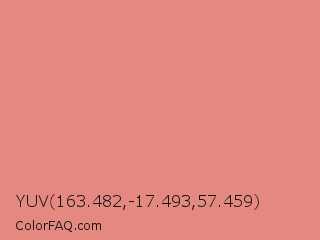 YUV 163.482,-17.493,57.459 Color is a light red color and the nearest color is Middle Red #e58e73. Hex code #e58980 and RGB value is rgb(229,137,128). In RGB color space, this color is composed of 90% red, 54% green, 50% blue, In CMYK color space, this color is composed of 0% cyan, 40% magenta, 44% yellow , 10% black , In HSL color space, this color has a hue angle of 5° , 66% saturation and 70% lightness.