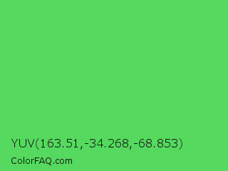 YUV 163.51,-34.268,-68.853 Color is a normal green color and the nearest color is Emerald #50c878. Hex code #55d95e and RGB value is rgb(85,217,94). In RGB color space, this color is composed of 33% red, 85% green, 37% blue, In CMYK color space, this color is composed of 61% cyan, 0% magenta, 57% yellow , 15% black , In HSL color space, this color has a hue angle of 124° , 63% saturation and 59% lightness.