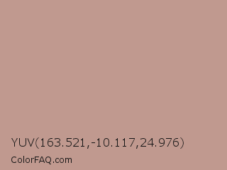 YUV 163.521,-10.117,24.976 Color is a light red color and the nearest color is Quicksand #bd978e. Hex code #c0998f and RGB value is rgb(192,153,143). In RGB color space, this color is composed of 75% red, 60% green, 56% blue, In CMYK color space, this color is composed of 0% cyan, 20% magenta, 26% yellow , 25% black , In HSL color space, this color has a hue angle of 12° , 28% saturation and 66% lightness.