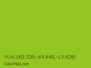 YUV 163.539,-64.849,-13.628 Color is a normal lime color and the nearest color is Atlantis #97cd2d. Hex code #94c520 and RGB value is rgb(148,197,32). In RGB color space, this color is composed of 58% red, 77% green, 13% blue, In CMYK color space, this color is composed of 25% cyan, 0% magenta, 84% yellow , 23% black , In HSL color space, this color has a hue angle of 78° , 72% saturation and 45% lightness.
