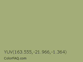 YUV 163.555,-21.966,-1.364 Color is a normal lime color and the nearest color is Green Smoke #a4af6e. Hex code #a2ad77 and RGB value is rgb(162,173,119). In RGB color space, this color is composed of 64% red, 68% green, 47% blue, In CMYK color space, this color is composed of 6% cyan, 0% magenta, 31% yellow , 32% black , In HSL color space, this color has a hue angle of 72° , 25% saturation and 57% lightness.