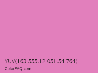 YUV 163.555,12.051,54.764 Color is a light magenta color and the nearest color is Middle Purple #d982b5. Hex code #e27fbc and RGB value is rgb(226,127,188). In RGB color space, this color is composed of 89% red, 50% green, 74% blue, In CMYK color space, this color is composed of 0% cyan, 44% magenta, 17% yellow , 11% black , In HSL color space, this color has a hue angle of 323° , 63% saturation and 69% lightness.