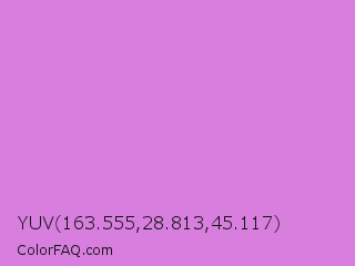 YUV 163.555,28.813,45.117 Color is a light magenta color and the nearest color is French Mauve #d473d4. Hex code #d77ede and RGB value is rgb(215,126,222). In RGB color space, this color is composed of 84% red, 49% green, 87% blue, In CMYK color space, this color is composed of 3% cyan, 43% magenta, 0% yellow , 13% black , In HSL color space, this color has a hue angle of 296° , 59% saturation and 68% lightness.