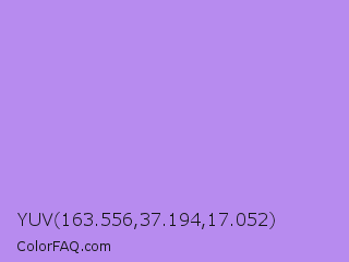 YUV 163.556,37.194,17.052 Color is a light violet color and the nearest color is Bright Lavender #bf94e4. Hex code #b78bef and RGB value is rgb(183,139,239). In RGB color space, this color is composed of 72% red, 55% green, 94% blue, In CMYK color space, this color is composed of 23% cyan, 42% magenta, 0% yellow , 6% black , In HSL color space, this color has a hue angle of 266° , 76% saturation and 74% lightness.