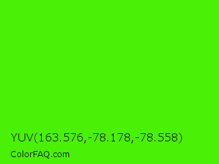 YUV 163.576,-78.178,-78.558 Color is a normal green color and the nearest color is Chlorophyll Green #4aff00. Hex code #4af005 and RGB value is rgb(74,240,5). In RGB color space, this color is composed of 29% red, 94% green, 2% blue, In CMYK color space, this color is composed of 69% cyan, 0% magenta, 98% yellow , 6% black , In HSL color space, this color has a hue angle of 102° , 96% saturation and 48% lightness.