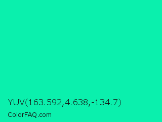 YUV 163.592,4.638,-134.7 Color is a normal green color and the nearest color is Medium Spring Green #00fa9a. Hex code #0af0ad and RGB value is rgb(10,240,173). In RGB color space, this color is composed of 4% red, 94% green, 68% blue, In CMYK color space, this color is composed of 96% cyan, 0% magenta, 28% yellow , 6% black , In HSL color space, this color has a hue angle of 163° , 92% saturation and 49% lightness.