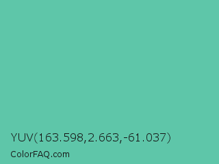 YUV 163.598,2.663,-61.037 Color is a normal green color and the nearest color is Tradewind #5fb3ac. Hex code #5ec6a9 and RGB value is rgb(94,198,169). In RGB color space, this color is composed of 37% red, 78% green, 66% blue, In CMYK color space, this color is composed of 53% cyan, 0% magenta, 15% yellow , 22% black , In HSL color space, this color has a hue angle of 163° , 48% saturation and 57% lightness.