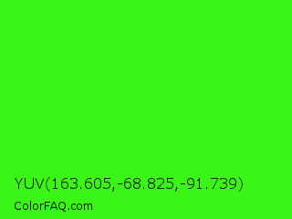 YUV 163.605,-68.825,-91.739 Color is a normal green color and the nearest color is Neon Green #39ff14. Hex code #3bf418 and RGB value is rgb(59,244,24). In RGB color space, this color is composed of 23% red, 96% green, 9% blue, In CMYK color space, this color is composed of 76% cyan, 0% magenta, 90% yellow , 4% black , In HSL color space, this color has a hue angle of 110° , 91% saturation and 53% lightness.