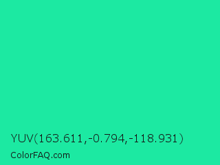 YUV 163.611,-0.794,-118.931 Color is a normal green color and the nearest color is Medium Spring Green #00fa9a. Hex code #1ce9a2 and RGB value is rgb(28,233,162). In RGB color space, this color is composed of 11% red, 91% green, 64% blue, In CMYK color space, this color is composed of 88% cyan, 0% magenta, 30% yellow , 9% black , In HSL color space, this color has a hue angle of 159° , 82% saturation and 51% lightness.