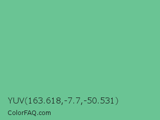 YUV 163.618,-7.7,-50.531 Color is a normal green color and the nearest color is Silver Tree #66b58f. Hex code #6ac494 and RGB value is rgb(106,196,148). In RGB color space, this color is composed of 42% red, 77% green, 58% blue, In CMYK color space, this color is composed of 46% cyan, 0% magenta, 24% yellow , 23% black , In HSL color space, this color has a hue angle of 148° , 43% saturation and 59% lightness.