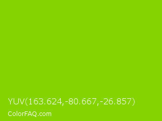 YUV 163.624,-80.667,-26.857 Color is a normal green color and the nearest color is Sheen Green #8fd400. Hex code #85d300 and RGB value is rgb(133,211,-0). In RGB color space, this color is composed of 52% red, 83% green, 0% blue, In CMYK color space, this color is composed of 37% cyan, 0% magenta, 100% yellow , 17% black , In HSL color space, this color has a hue angle of 82° , 100% saturation and 41% lightness.