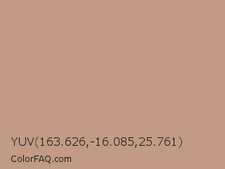 YUV 163.626,-16.085,25.761 Color is a light orange color and the nearest color is Pale Taupe #bc987e. Hex code #c19b83 and RGB value is rgb(193,155,131). In RGB color space, this color is composed of 76% red, 61% green, 51% blue, In CMYK color space, this color is composed of 0% cyan, 20% magenta, 32% yellow , 24% black , In HSL color space, this color has a hue angle of 23° , 33% saturation and 64% lightness.